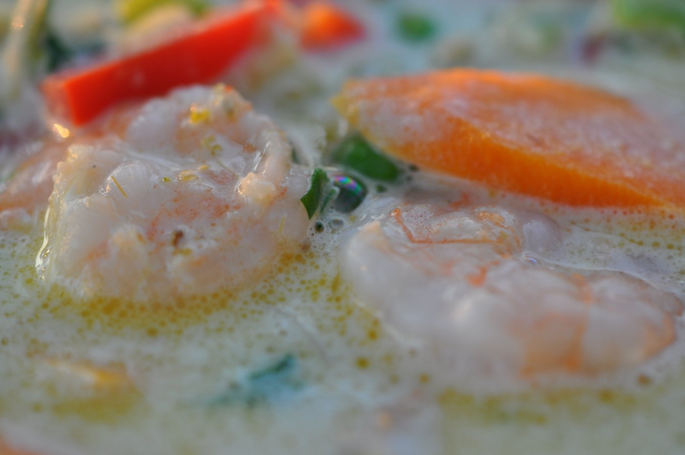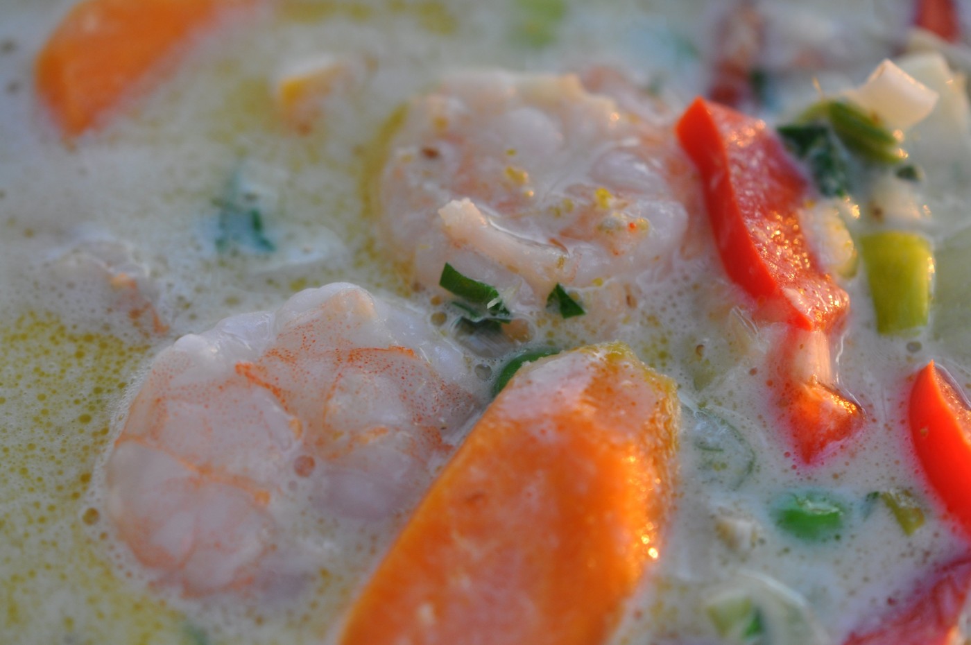 - Do hrnce dáme olej, který rozehřejeme. Na olej dáme restovat cibuli a česnek (2 minuty), poté přidáme zeleninu a krevety. Osolíme a opepříme.